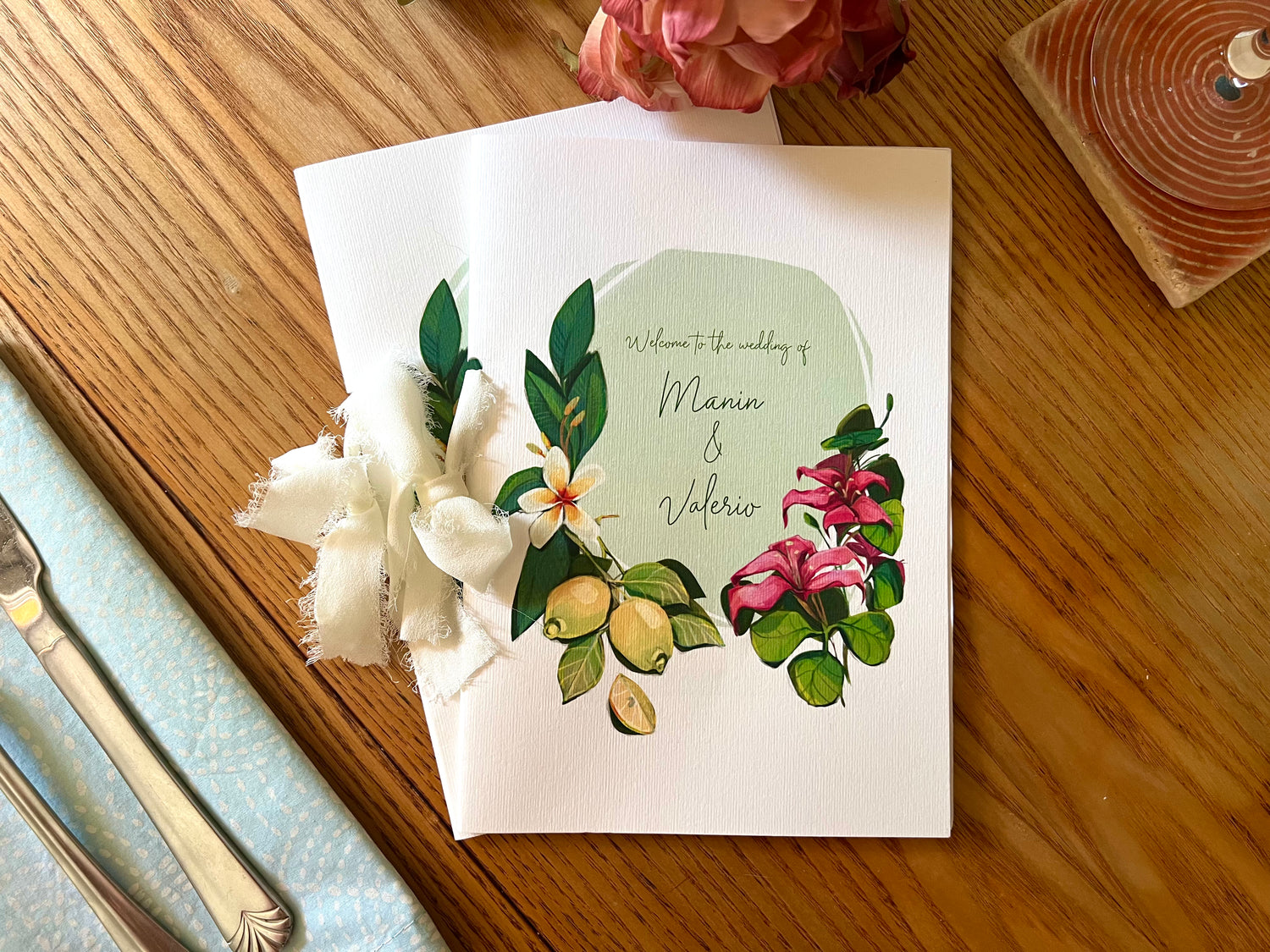 I was very honoured to work with Manin and Valerio to design the illustration for their wedding booklet. Manin is from Hong Kong, and Valerio from Sicily and they requested an illustration of the traditional flowers from each place.